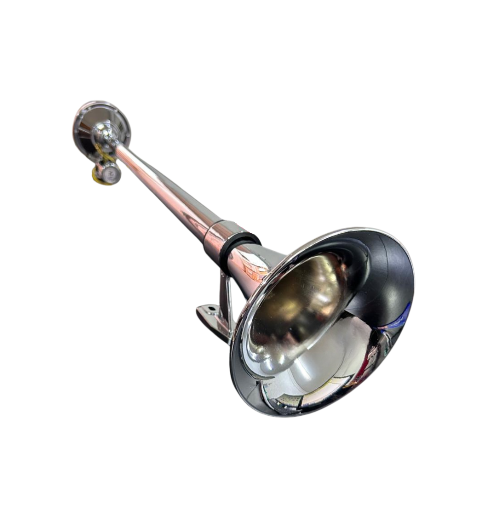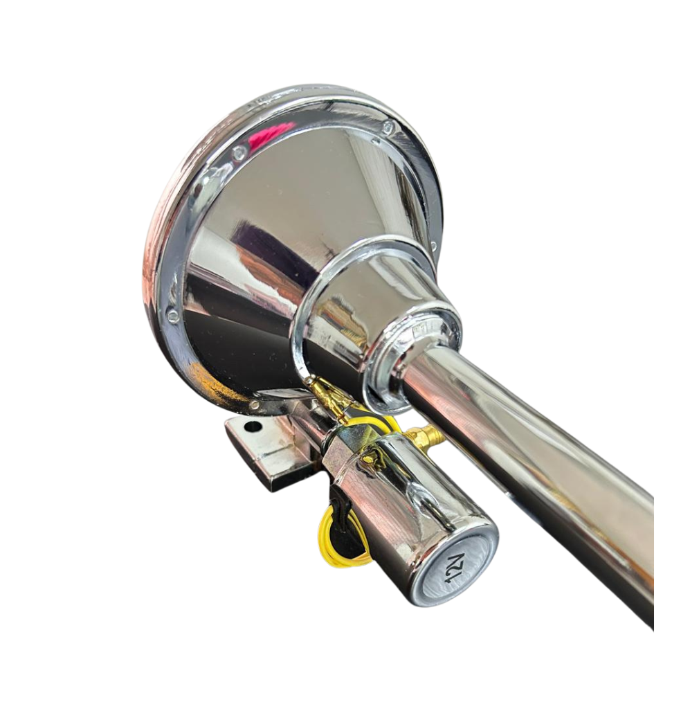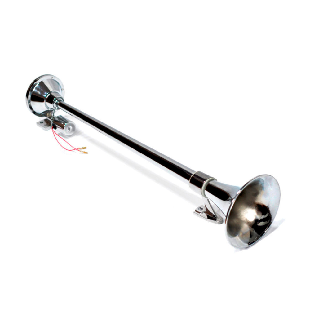 Buzina Marítima Cromada 12v com solenoide para caminhão, a única com 74cm de comprimento.